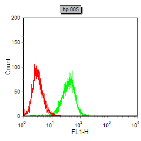 Flow cytometric analysis of Hela cells using CD14 mouse mAb (green) and negative control (red).