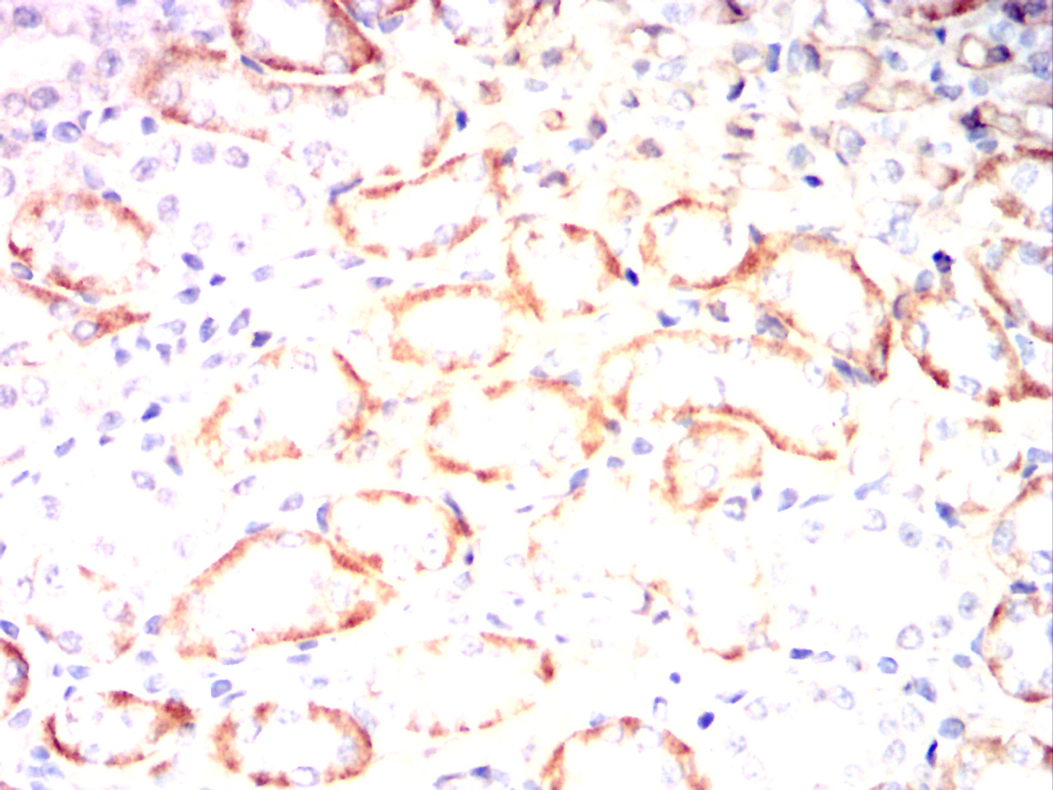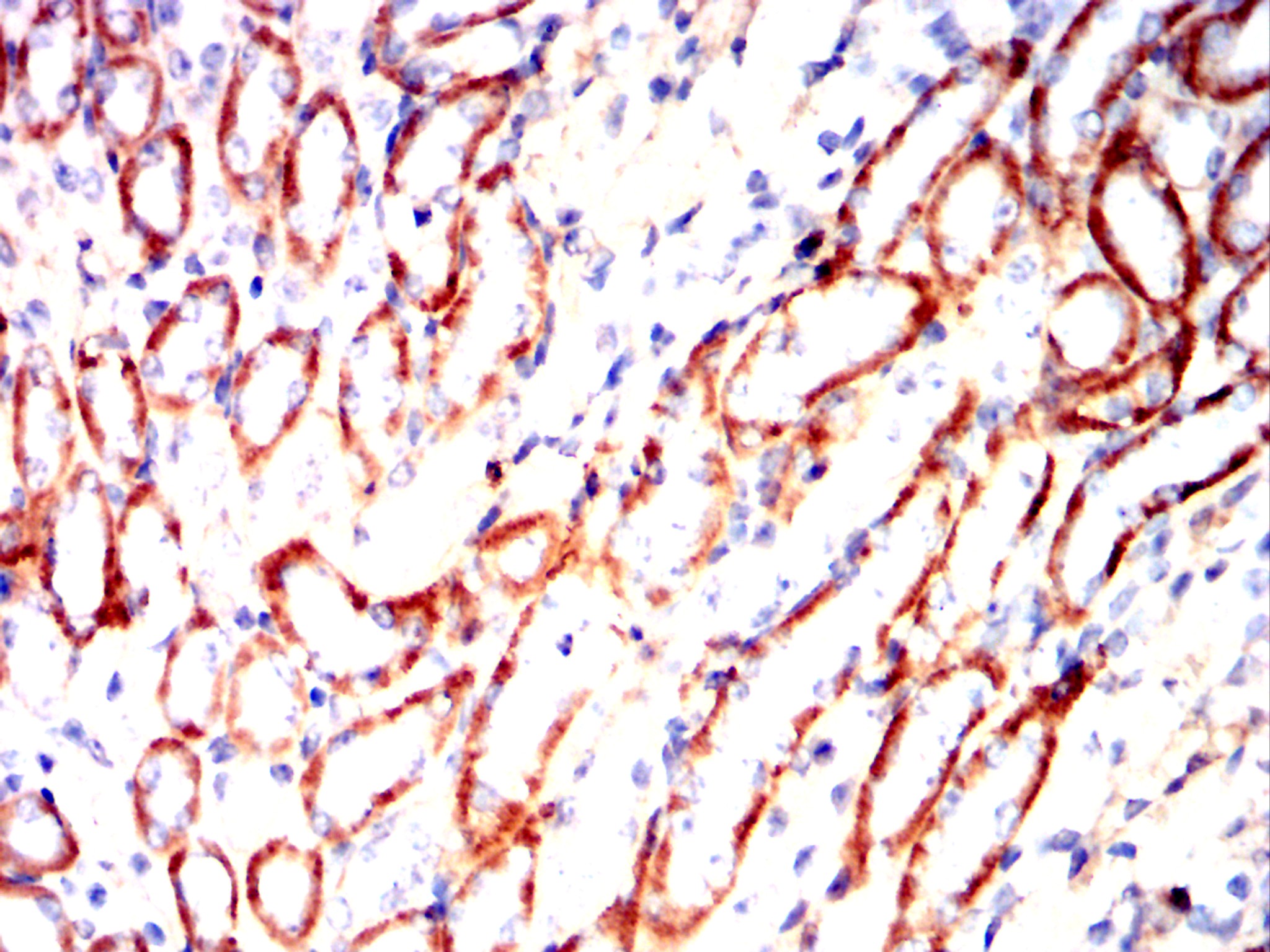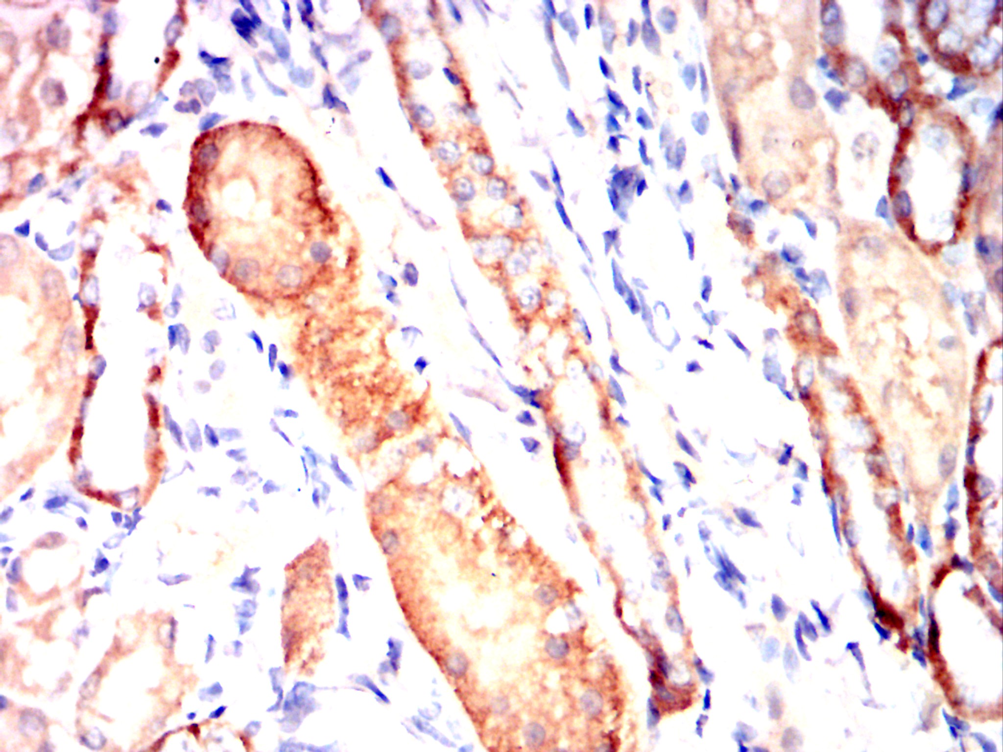 Immunohistochemical analysis of paraffin-embedded Rabbit kidney using CD14 mouse mAb with DAB staining.