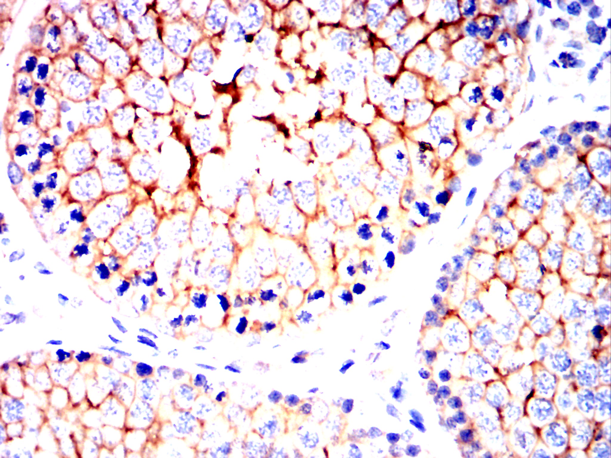 Immunohistochemical analysis of paraffin-embedded Mouse testis using NT5E mouse mAb with DAB staining.