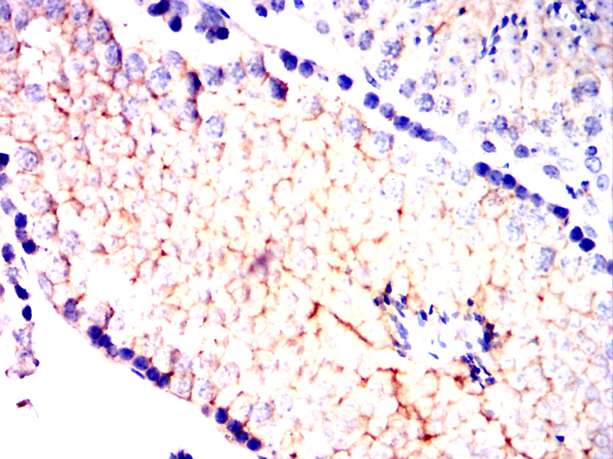Immunohistochemical analysis of paraffin-embedded Rabbit testis using NT5E mouse mAb with DAB staining.