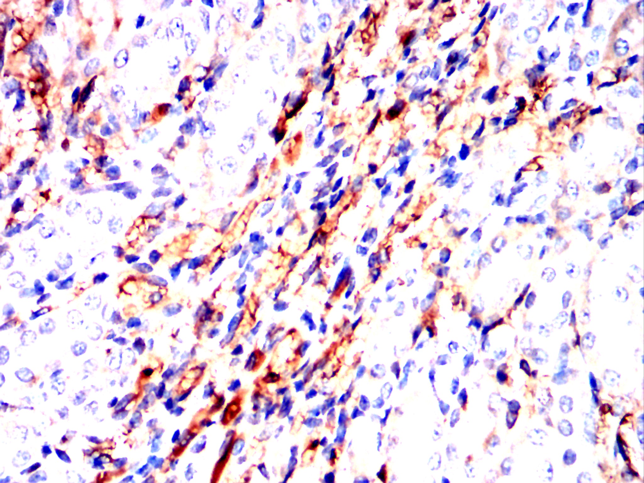 Immunohistochemical analysis of paraffin-embedded human esophageal cancer tissues using NT5E mouse mAb with DAB staining.