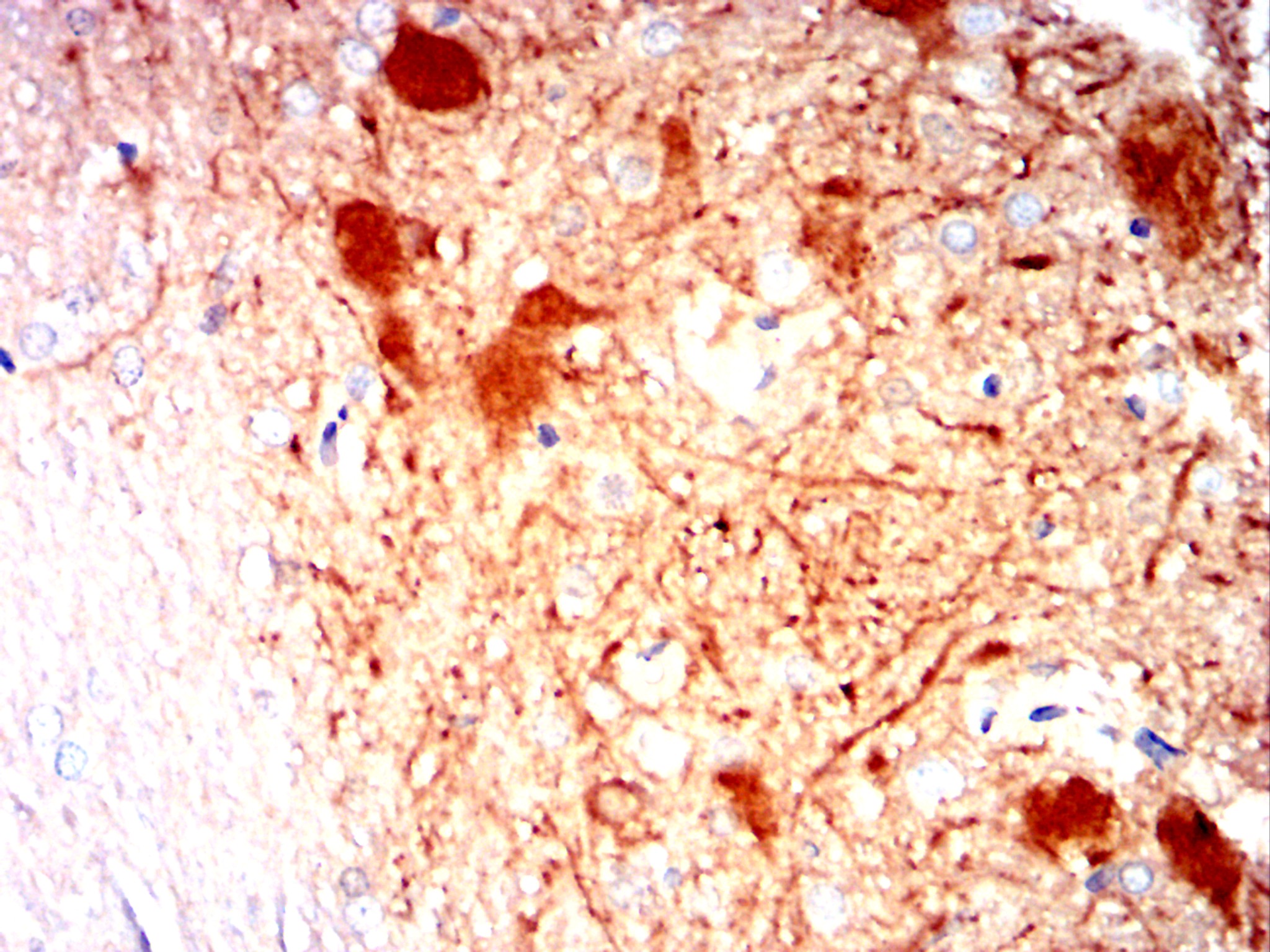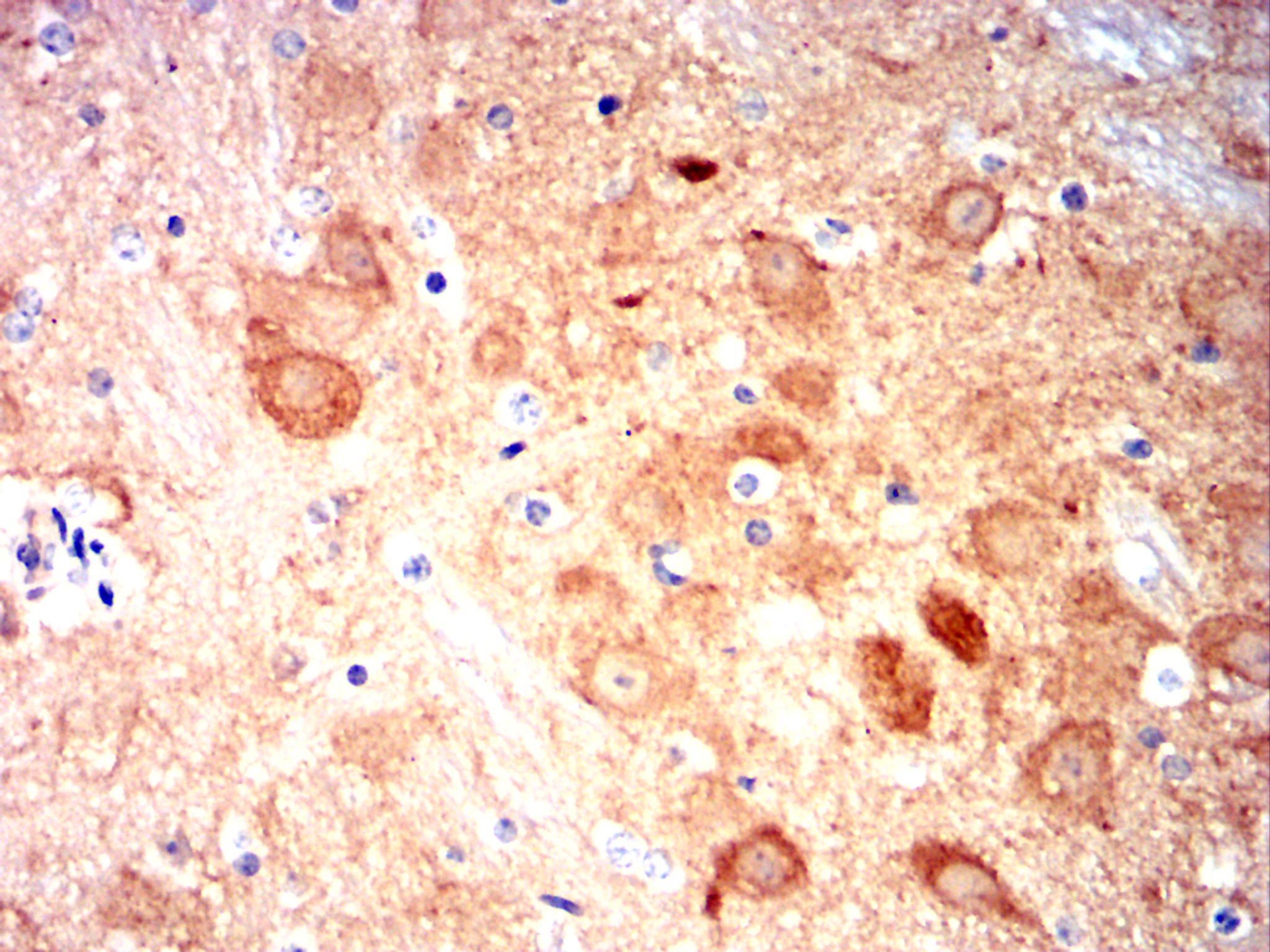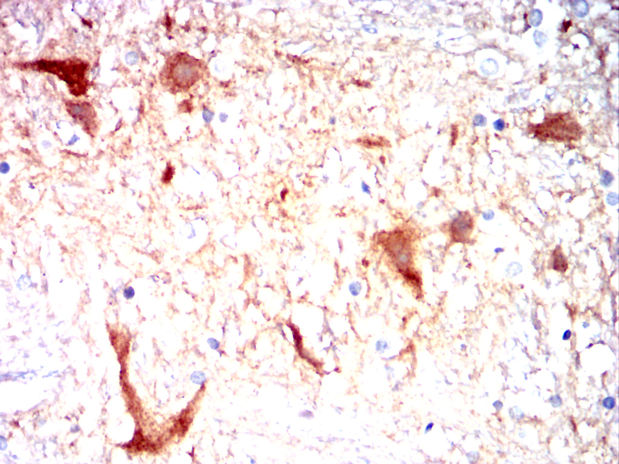 Immunohistochemical analysis of paraffin-embedded Rabbit spinal cord using CAMK2G mouse mAb with DAB staining.