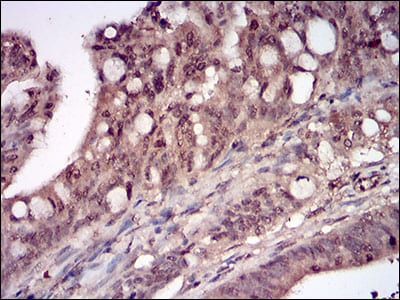Immunohistochemical analysis of paraffin-embedded human rectum cancer tissues using DDIT3 mouse mAb with DAB staining.