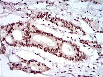 Immunohistochemical analysis of paraffin-embedded human colon cancer tissues using KHDRBS2 mouse mAb with DAB staining.