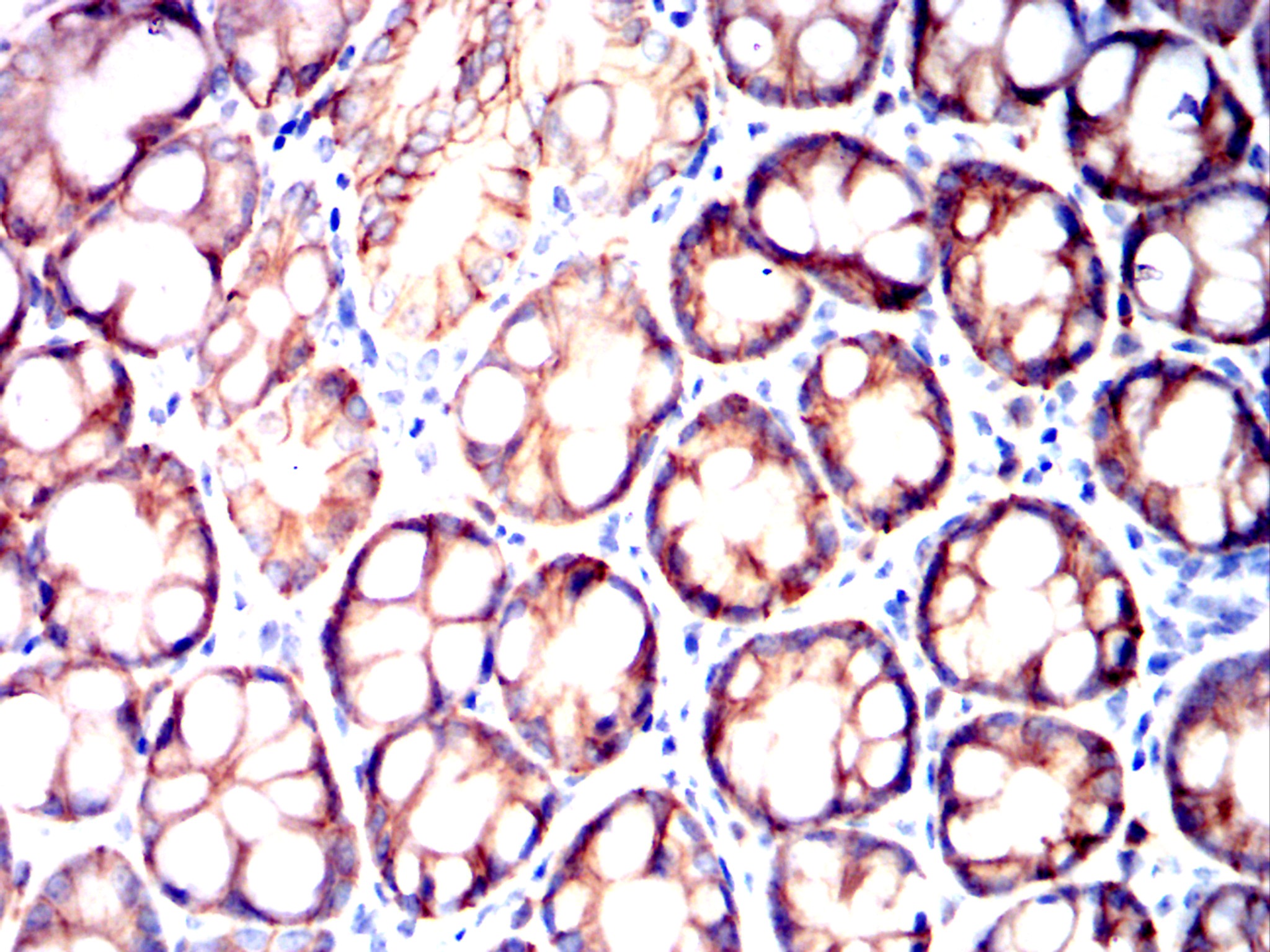 Immunohistochemical analysis of paraffin-embedded Mouse colon using EPCAM mouse mAb with DAB staining.