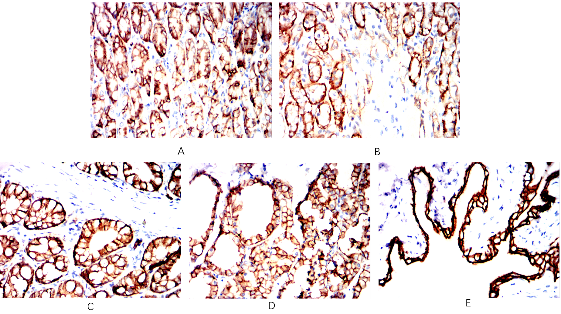 Immunohistochemical analysis of paraffin-embedded Rat stomach(A)Rat kidney(B)Rat colon(C)Rat thyroid(D)Rat bladder(E) using EPCAM mouse mAb with DAB staining.