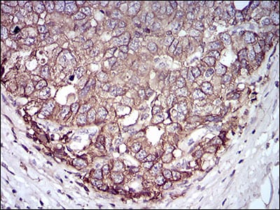 Immunohistochemical analysis of paraffin-embedded human cervical cancer tissues using EPCAM mouse mAb with DAB staining.