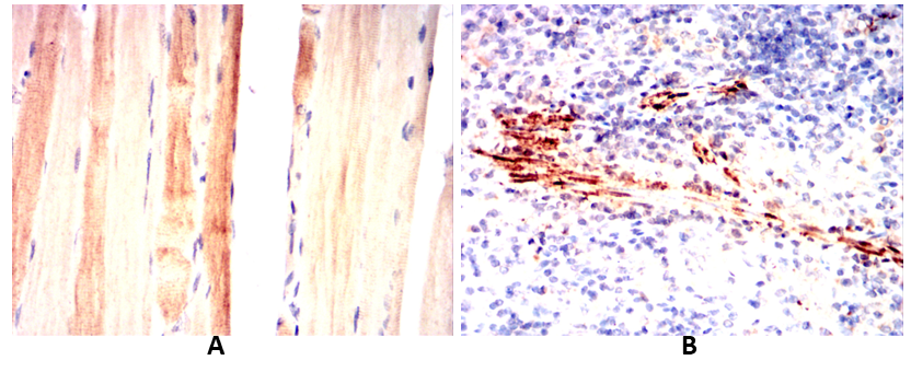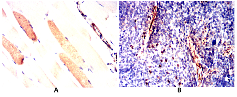 Immunohistochemical analysis of paraffin-embedded Rat spleen(A) Rat muscle(B) using CNN1 mouse mAb with DAB staining.