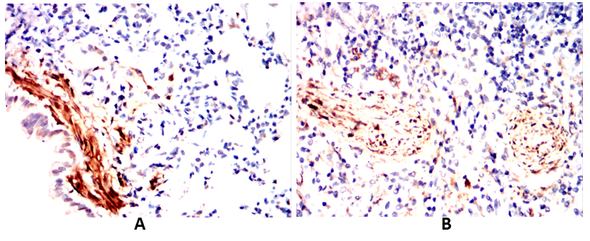 Immunohistochemical analysis of paraffin-embedded Rabbit lung using CNN1 mouse mAb with DAB staining.