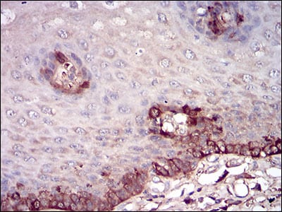 Immunohistochemical analysis of paraffin-embedded human esophageal tissues using FTL mouse mAb with DAB staining.
