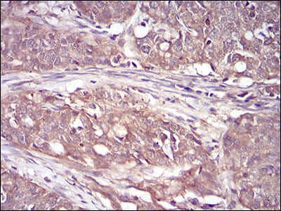 Immunohistochemical analysis of paraffin-embedded human cervical cancer tissues using RPS6KA2 mouse mAb with DAB staining.