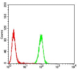 Flow cytometric analysis of K562 cells using EMD mouse mAb (green) and negative control (red).