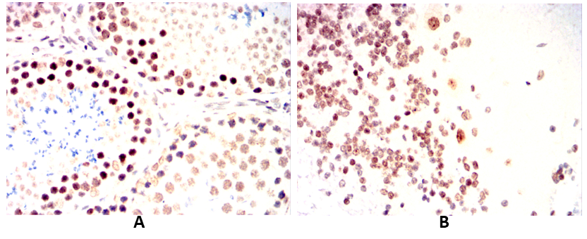 Immunohistochemical analysis of paraffin-embedded Rat brain(A) Rat testicles(B) using WTAP mouse mAb with DAB staining.