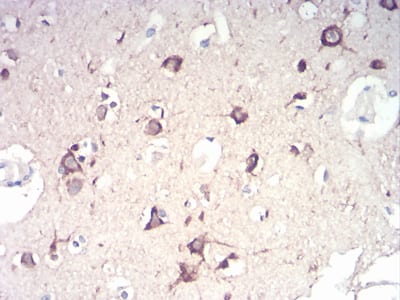 Immunohistochemical analysis of paraffin-embedded human brain tissues using NFKBIA mouse mAb with DAB staining.