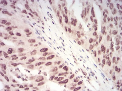 Immunohistochemical analysis of paraffin-embedded human cervical cancer tissues using CBX1 mouse mAb with DAB staining.
