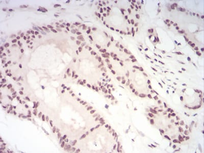 Immunohistochemical analysis of paraffin-embedded human colon cancer tissues using CBX1 mouse mAb with DAB staining.