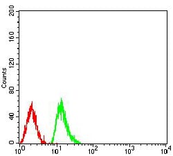 Flow cytometric analysis of Raji cells using HIST2H4A(20Me) mouse mAb (green) and negative control (red).