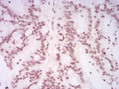 Immunohistochemical analysis of paraffin-embedded human colon cancer tissues using HIST2H4A(20Me) mouse mAb with DAB staining.
