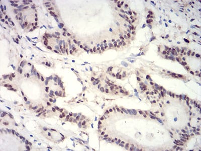 Immunohistochemical analysis of paraffin-embedded human colon cancer tissues using HIST2H3C(27Ac) mouse mAb with DAB staining.