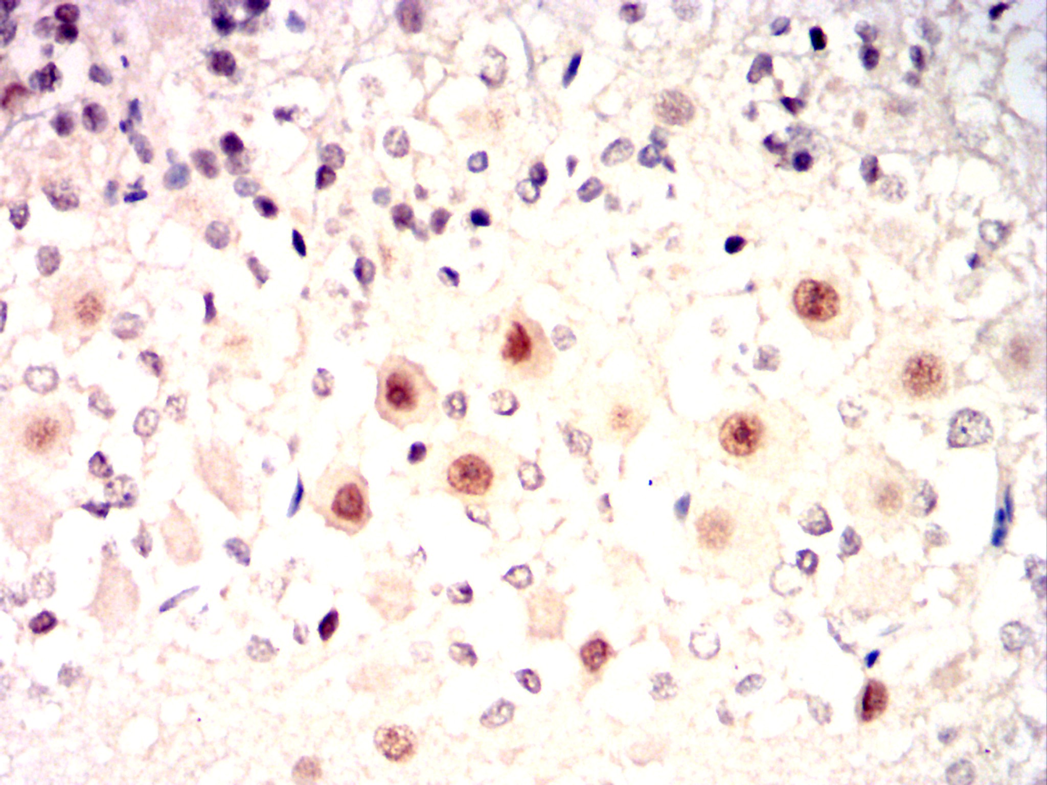 Immunohistochemical analysis of paraffin-embedded human liver cancer tissues using FOXP3 mouse mAb with DAB staining.