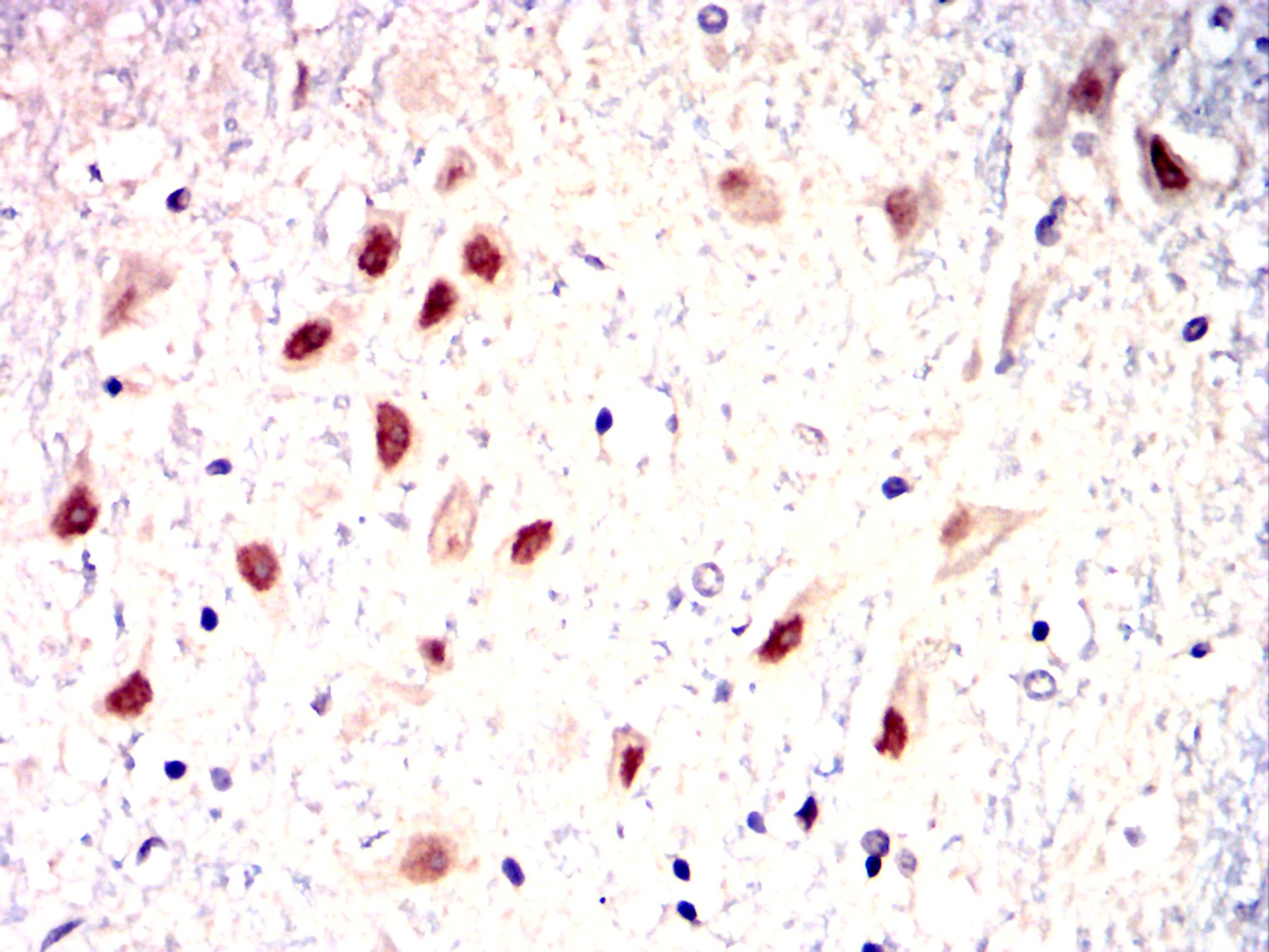 Immunohistochemical analysis of paraffin-embedded Rabbit spinal cord using FOXP3 mouse mAb with DAB staining.
