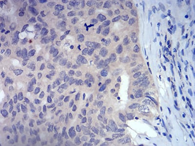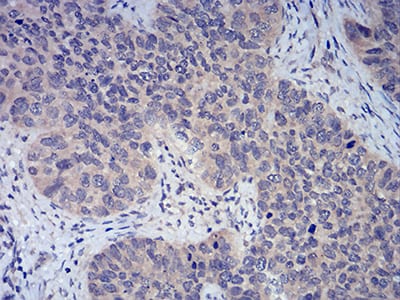 Immunohistochemical analysis of paraffin-embedded human cervical cancer tissues using FOXP3 mouse mAb with DAB staining.