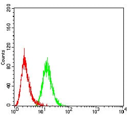 Flow cytometric analysis of Hela cells using BMP4 mouse mAb (green) and negative control (red).