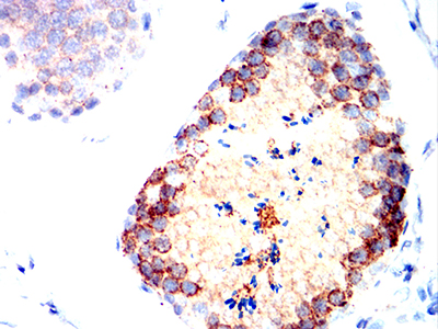 Immunohistochemical analysis of paraffin-embedded Rabbit testis using mTOR mouse mAb with DAB staining.