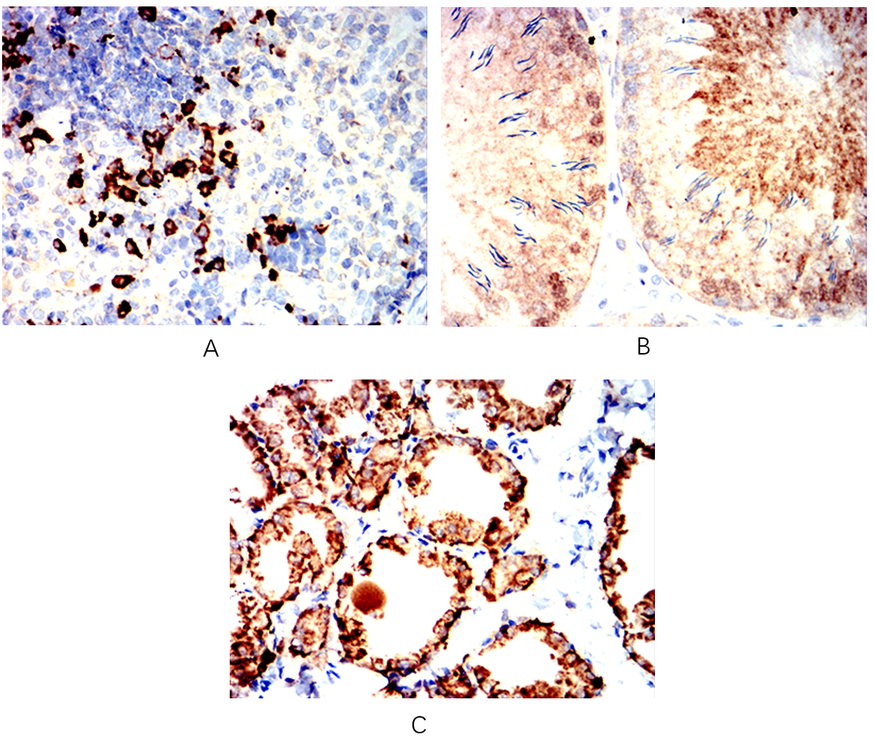 Immunohistochemical analysis of paraffin-embedded Rat spleen(A)Rat testis(B)Rat thyroid(C) using mTOR mouse mAb with DAB staining.