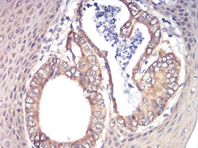 Immunohistochemical analysis of paraffin-embedded human esophageal cancer tissues using RAD21 mouse mAb with DAB staining.