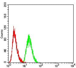 Flow cytometric analysis of Hela cells using MAP2K3 mouse mAb (green) and negative control (red).
