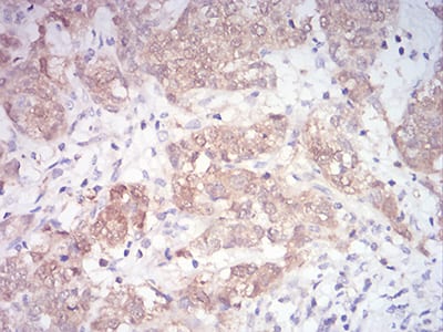 Immunohistochemical analysis of paraffin-embedded human bladder cancer tissues using MAP2K3 mouse mAb with DAB staining.
