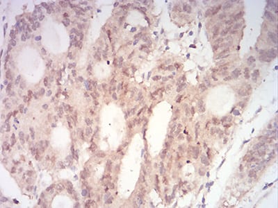 Immunohistochemical analysis of paraffin-embedded human rectum cancer tissues using MAP2K3 mouse mAb with DAB staining.