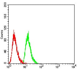 Flow cytometric analysis of Hela cells using RAN mouse mAb (green) and negative control (red).