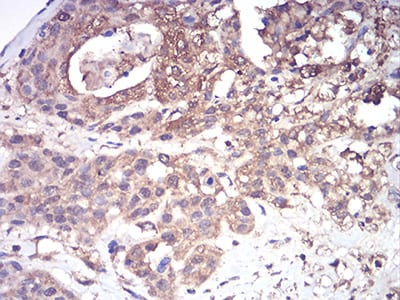 Immunohistochemical analysis of paraffin-embedded human cervical cancer tissues using CFHR5 mouse mAb with DAB staining.