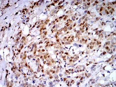 Immunohistochemical analysis of paraffin-embedded human breast cancer tissues using PSMC3 mouse mAb with DAB staining.
