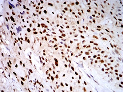 Immunohistochemical analysis of paraffin-embedded human breast cancer tissues using PSMC3 mouse mAb with DAB staining.