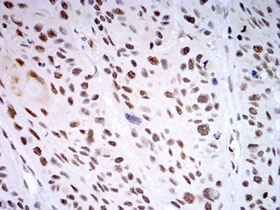 Immunohistochemical analysis of paraffin-embedded human esophageal cancer tissues using KDM1A mouse mAb with DAB staining.