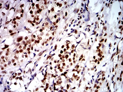 Immunohistochemical analysis of paraffin-embedded human bladder cancer tissues using DDX1 mouse mAb with DAB staining.