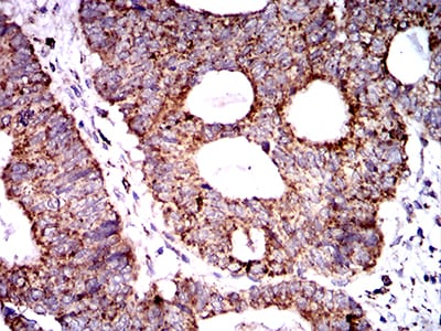 Immunohistochemical analysis of paraffin-embedded human rectum cancer tissues using SOD2 mouse mAb with DAB staining.