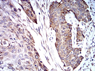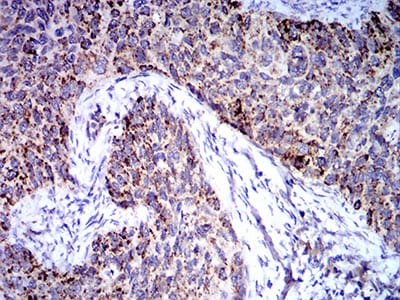 Immunohistochemical analysis of paraffin-embedded human cervical cancer tissues using TRIM25 mouse mAb with DAB staining.