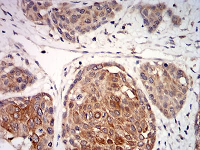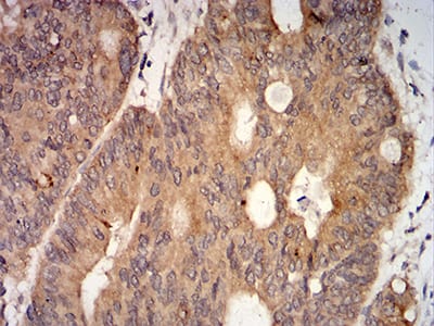 Immunohistochemical analysis of paraffin-embedded human rectum cancer tissues using CPV-NS1 mouse mAb with DAB staining.