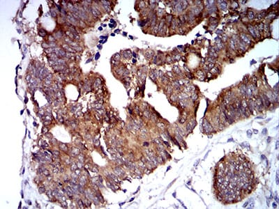 Immunohistochemical analysis of paraffin-embedded human rectum cancer tissues using TRIM25 mouse mAb with DAB staining.