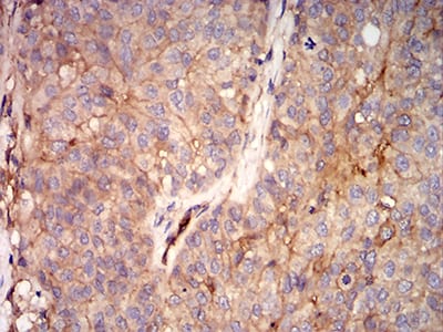 Immunohistochemical analysis of paraffin-embedded human bladder cancer tissues using RALB mouse mAb with DAB staining.