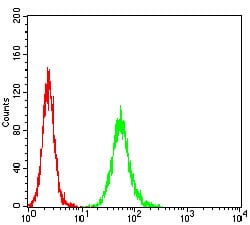 Flow cytometric analysis of Hela cells using ANAPC10 mouse mAb (green) and negative control (red).
