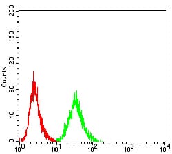 Flow cytometric analysis of Hela cells using TFAP2A mouse mAb (green) and negative control (red).