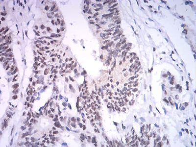 Immunohistochemical analysis of paraffin-embedded human colon cancer tissues using ASH2L mouse mAb with DAB staining.