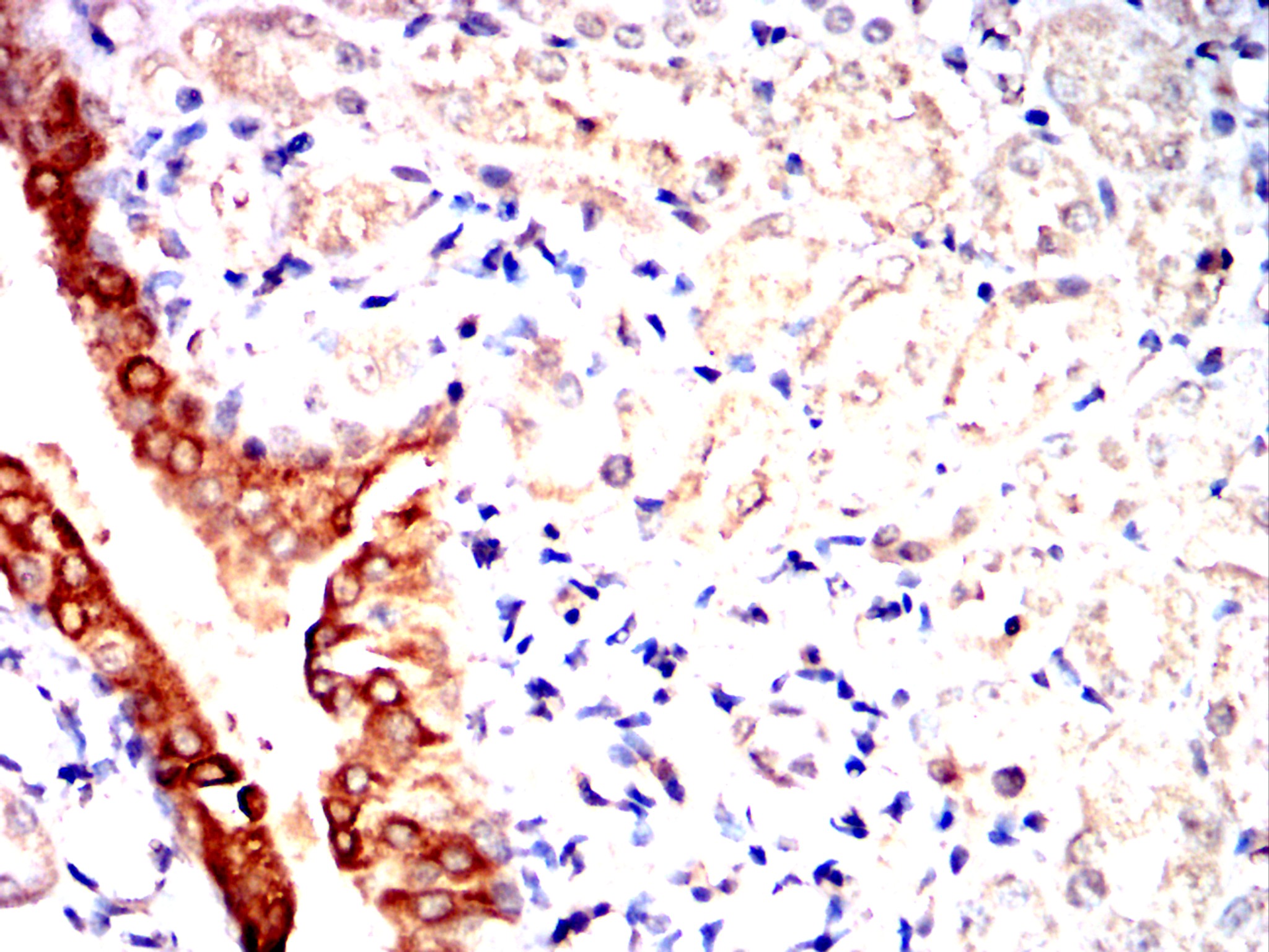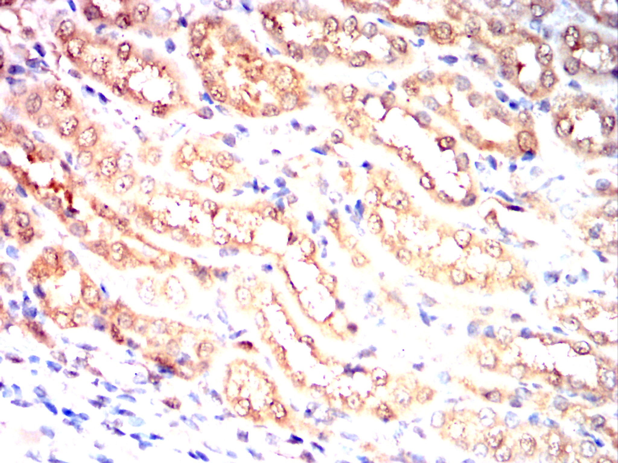 Immunohistochemical analysis of paraffin-embedded Rabbit kidney using PRKAA2 mouse mAb with DAB staining.