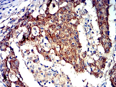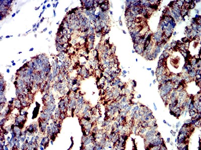 Immunohistochemical analysis of paraffin-embedded human rectum cancer tissues using PRKAA2 mouse mAb with DAB staining.
