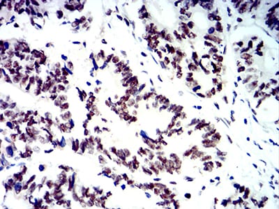Immunohistochemical analysis of paraffin-embedded human rectum cancer tissues using SMARCA1 mouse mAb with DAB staining.